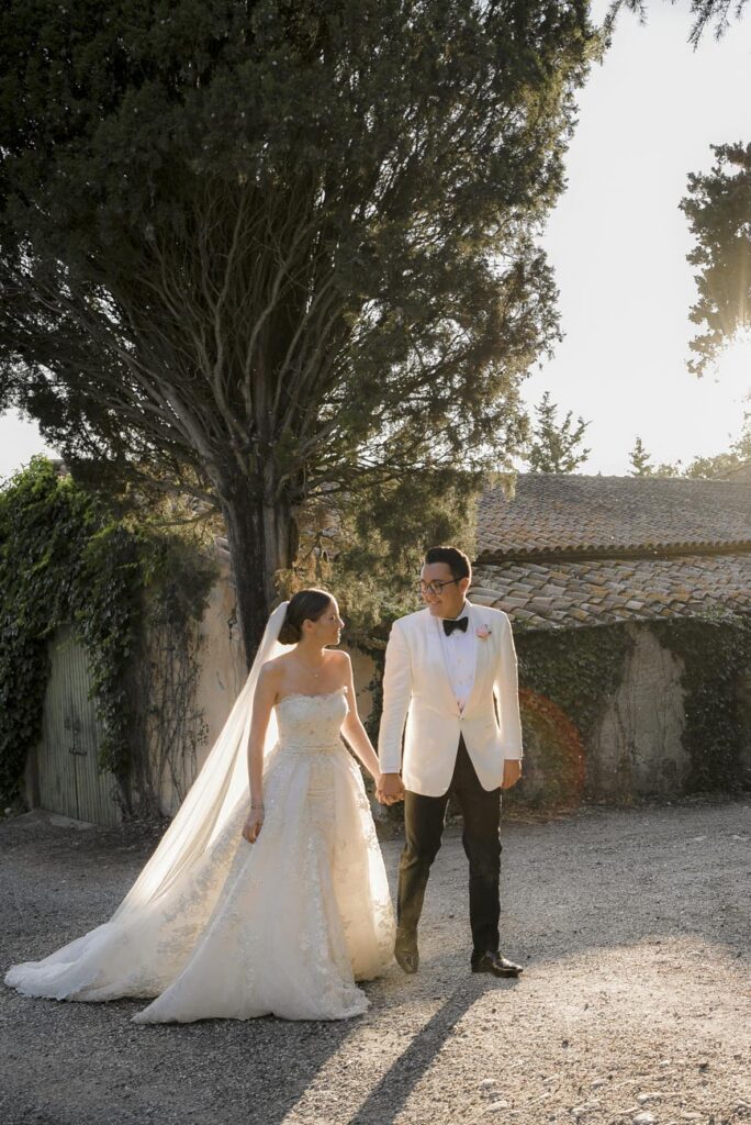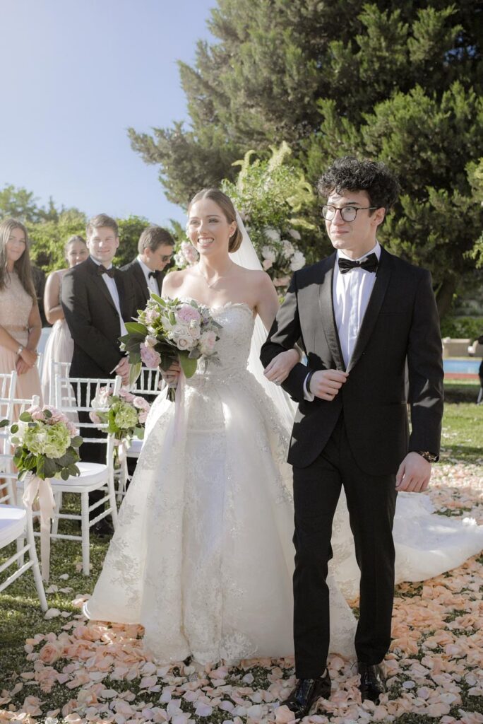 Bride and groom walking along the aisle in their outfits that were just perfect with all the ambience and atmosphere.